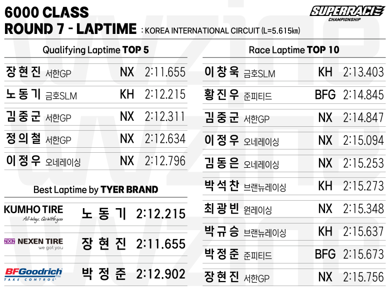 예선에서 판단 미스로 11그리드에 머물렀던 이창욱은 결승에서 2:13.403의 패스티스트 랩타임을 선보이며 추월을 거듭해 결국 우승을 쟁취했다. 결승 초반 3위까지 자리했던 황진우는 2:14.845의 빠른 랩타임을 보여주었으나 순위를 유지하지 못해 11위로 결승선을 통과했고, 3그리드에서 출발해 2위로 포디엄의 한 자리를 밟은 김중군은 2:14.847으로 넥센타이어에서 결승 중 가장 빨랐던 랩타임을 기록했다.
