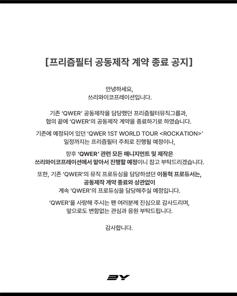 전담 소속사인 쓰리와이코프레이션이 전해온 바에 따르면, QWER의 매니지먼트 및 공동 제작에서 프리즘필터 뮤직그룹과의 계약을 종료하고 향후 쓰리와이코프레이션이 단독으로 업무를 맡아 진행하게 된다. 다만 뮤직 프로듀싱을 담당했던 이동혁 PD는 그대로 프로듀싱을 담당해 줄 것으로 알려졌다.