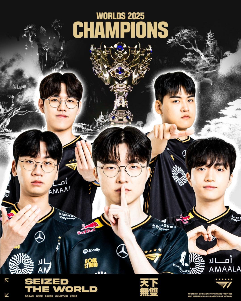 ‘2025 LOL 월드 챔피언십'(이하 2025 월즈)에서 LCK 소속 T1이 5세트까지 가는 치열한 접전 끝에 3:2로 KT롤스터를 꺽고 소환사의 컵을 거머쥐었다.