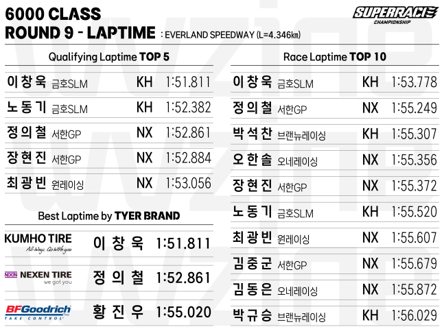 한편 8라운드에 이어 9라운드에서도 열세를 보인 BF굿리치 타이어의 성능은 실망감을 안겨주었다. 글로벌 모터스포츠 용이라는 네임 밸류에 비해 퍼포먼스와 내구도 모두 기대에 미치지 못한 BF굿리치 타이어의 성적표는 내년 시즌 당연스럽게도 퇴출을 떠오르게 만든다. 과연 새로운 타이어 메이커가 등장할 것인지, 아니면 절치부심한 BF굿리치가 반전을 보여줄 것인지 지켜볼 부분이다.