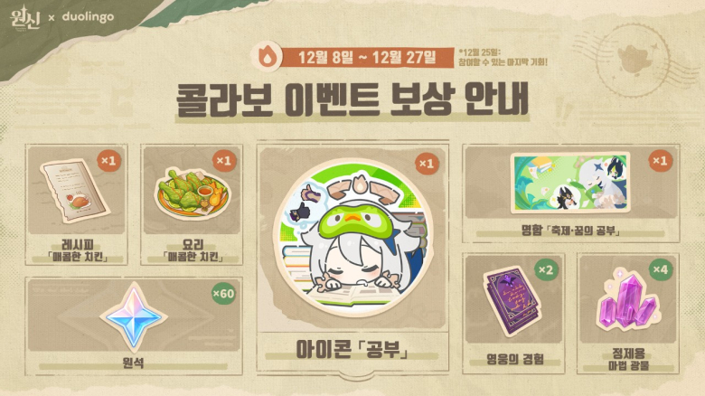 3일 연속 학습 퀘스트를 완료한 이용자는 2025년 12월 30일 23:59:59까지 듀오링고 애플리케이션의 ‘상점’ 탭에서 리딤 코드를 수령할 수 있으며, 2026년 1월 31일 15:59:59까지 원신 인게임 보상으로 교환할 수 있다. 보상을 획득하기 위해 3일 연속 학습 퀘스트에 마지막으로 참여할 수 있는 일자는 2025년 12월 25일이다.