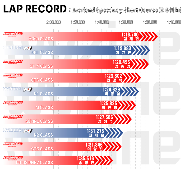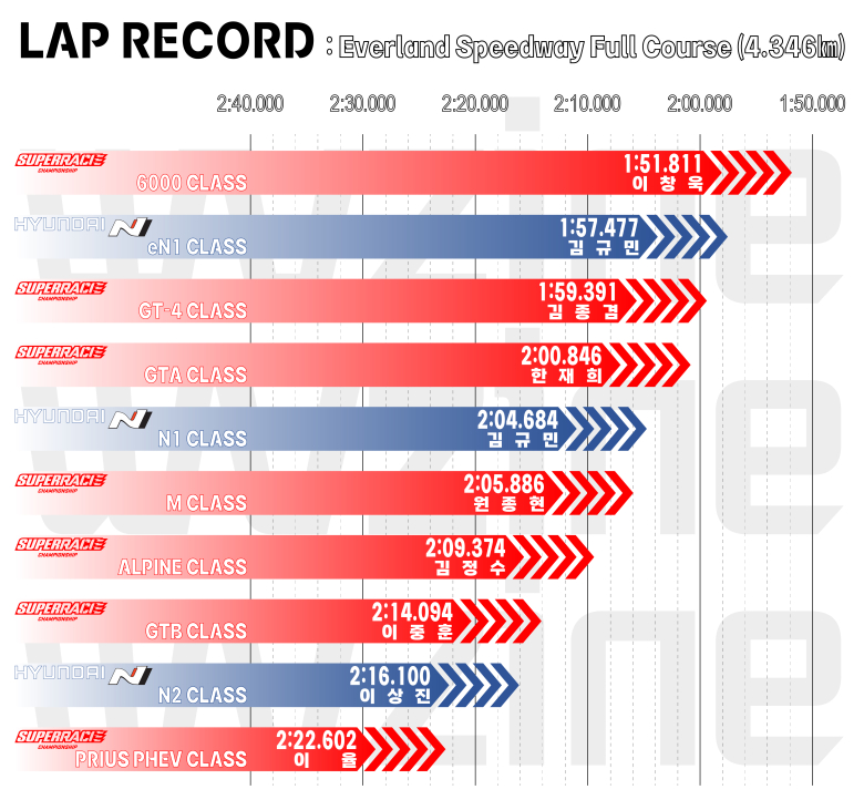 슈퍼레이스 챔피언십 중 최근 에버랜드 스피드웨이에서 치러진 클래스는 7개 클래스이며, 현대N페스티벌은 3개 클래스가 진행된 바 있다. 총 10개 클래스 중 가장 빠른 랩 레코드 기록은 토요타 가주 레이싱 6000클래스(이하 6000클래스)의 이창욱(금호SLM)이 지난 11월 2일 수립한 1분 51.811초이며, 그 다음으로는 eN1클래스에서 김규민(DCT레이싱)이 기록한 1분 567.477초로 나타났다.