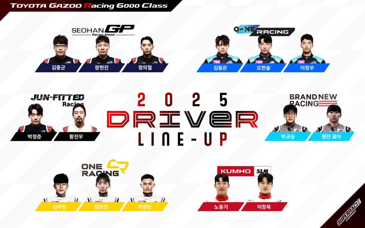 2025 오네 슈퍼레이스 챔피언십의 대표 종목인 토요타 가주 레이싱 6000클래스(이하 6000클래스)의 각 팀별 최종 라인업이 공개되었다. 슈퍼레이스(대표 김동빈)는 총 6개 팀, 15명의 드라이버의 엔트리를 발표하며, 슈퍼레이스 최상위 클래스에서 시즌 챔피언 타이틀을 두고 치열한 경쟁을 펼칠 예정이라고 밝혔다.