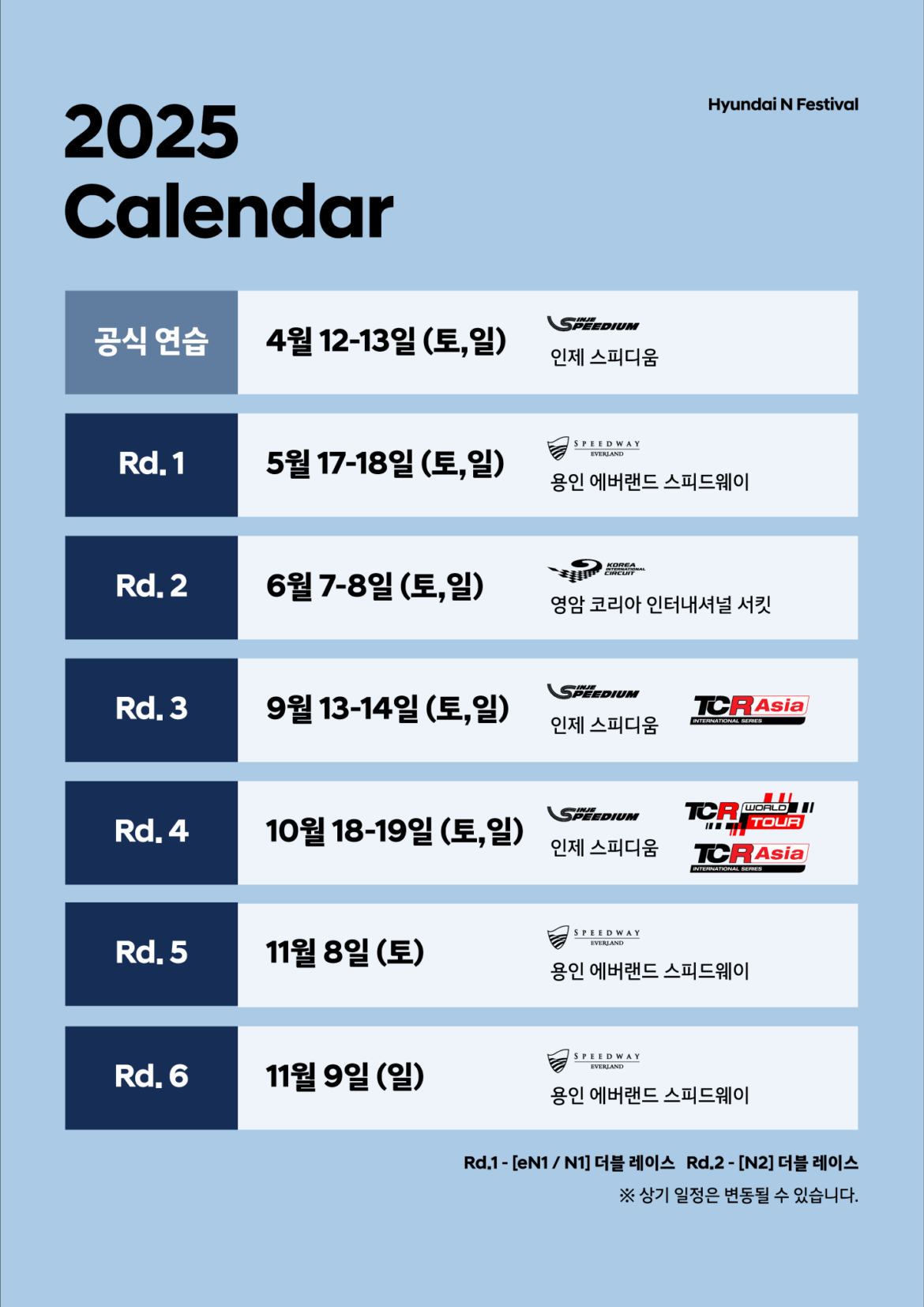2025 현대N페스티벌의 개막전 일정이 변경되었다. 현대 N 페스티벌 조직 위원회는 eN1 클래스의 레이스 포맷과 N2 클래스 주요 파츠가 변경됨에 따라 안전하고 체계적인 대회 운영을 위해 부득이 당초 예정된 4월 개막전을 5월로 변경하게 되었다고 밝혔다. 이에 따라 4월 12~13일에 예정되었던 일정은 공식 연습으로 대체하였으며, 개막전은 5월 17일과 18일에 걸쳐 용인 에버랜드 스피드웨이에서 개최되게 되었다.