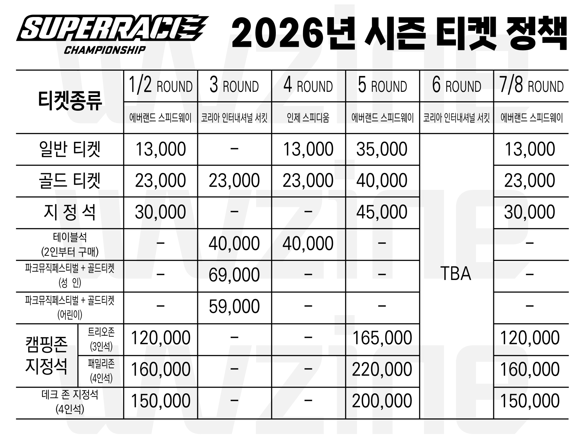대한민국 최대 규모의 모터스포츠 대회를 표방하는 슈퍼레이스(대표 마석호)가 2026년 시즌을 앞두고 각 라운드별로 판매하게 될 티켓 종류와 가격을 공개했다.