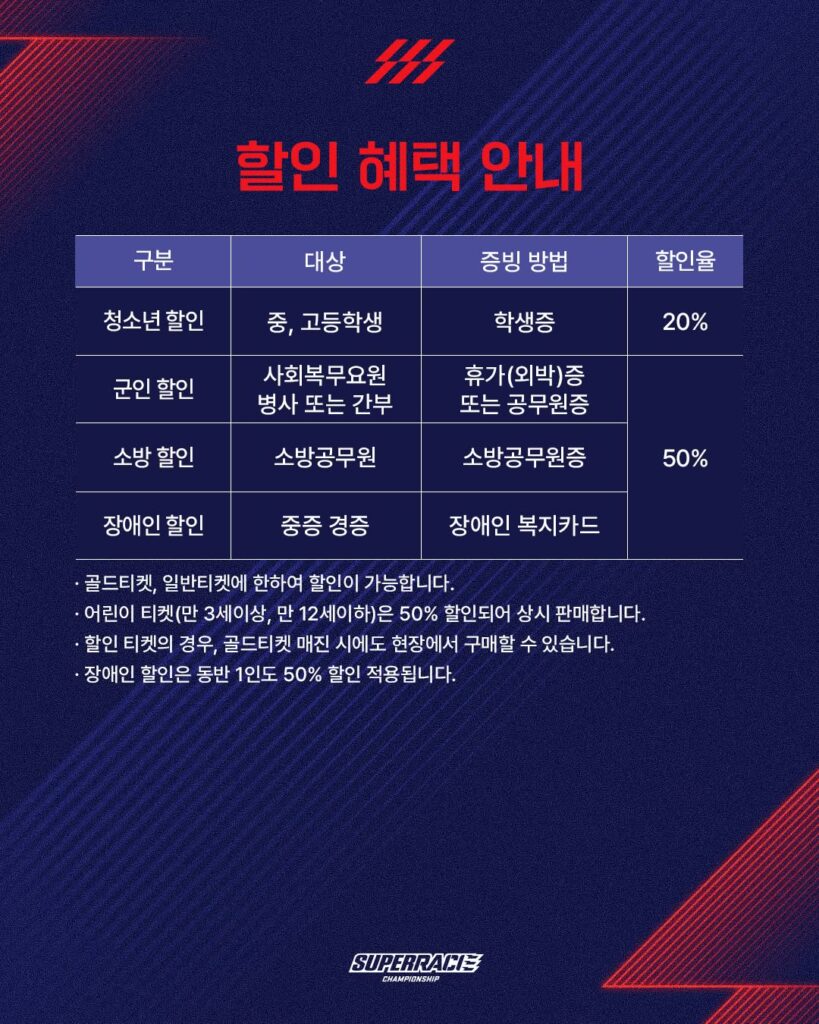 슈퍼레이스는 청소년 및 군인, 소방공무원과 장애인을 위한 할인 정책도 마련했다. 중ㆍ고등학생은 학생증을 제시하면 20% 할인을 받을 수 있으며, 군인, 소방공무원, 장애인은 관련 증빙자료를 제시하면 50% 할인된 가격으로 티켓 구입이 가능하다.
