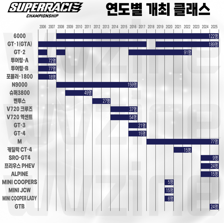 2006년부터 이어지며 가장 많은 141회의 경기가 치러진 GTA(GT-1클래스 포함)클래스는 189명의 드라이버가 경쟁을 펼치며 슈퍼레이스의 또 다른 중심축을 이뤄왔다. 투어링 클래스로 시작해 슈퍼1600클래스, N9000클래스와 벤투스클래스 등으로 계보를 이어오는 입문 클래스는 상위 클래스로 도전하는 레이서들의 가교 역할을 수행했으며, 슈퍼3800클래스, M클래스, 프리우스 PHEV클래스, 알핀클래스와 같은 원메이크 시합으로 순수하게 드라이버의 기량을 저울질 해 볼 수 있는 기회로 마련됐다.