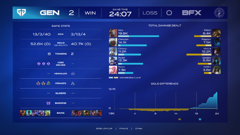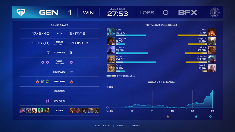 5판 3선승제로 진행된 결승전은 전날 디플러스 기아(이하 DK)를 세트 스코어 3:0으로 압승을 거둔 BFX와 7연승을 거두며 무패로 결승전에 진출한 GEN가 맞선 가운데, 경기 개시 채 5분도 되지 않아 김건부(Canyon, GEN)가 남대근(Diable, BFX)을 잡아내 이날 경기의 첫 킬을 장식한데 이어 5분차에 등장한 드래곤도 GEN이 가져가며 착실한 승리의 빌드업을 밟아 나갔다.