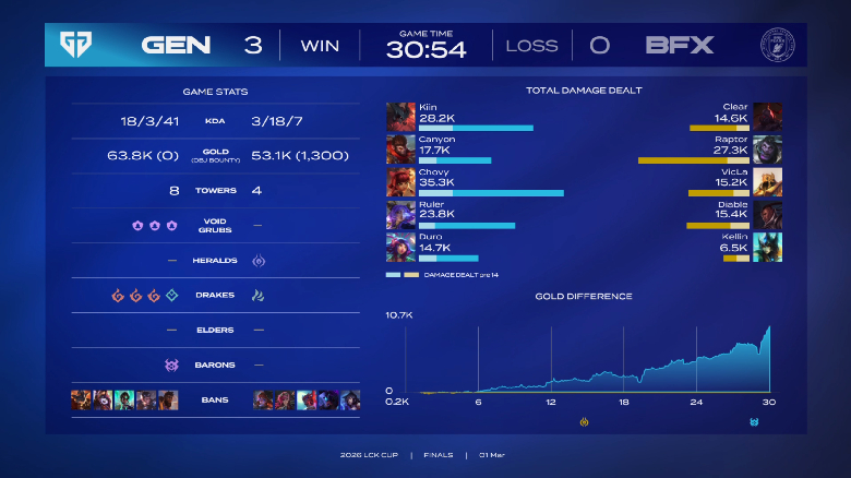 ‘2026 LCK컵'(이하 LCK CUP) 최종 우승의 영광이 _에게로 돌아갔다. 3월 1일 홍콩 카이탁 아레나에서 펼쳐진 ‘리그 오브 레전드'(이하 LoL) e-sports의 한국 프로 리그인 ‘리그 오브 레전드 챔피언십 코리아'(이하 LCK)의 2026년 첫 정규 리그인 LCK CUP 결승전에서 젠지 이스포츠(이하 GEN)는 BNK 피어엑스(이하 BFX)에 맞서 세트 스코어 3:0의 압도적 결과로 승리를 거머쥐며 호쾌한 시즌 스타트를 장식했다.