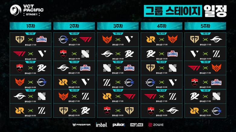 올해의 첫 번째 VCT 퍼시픽 정규 시즌인 스테이지 1은 4월 3일(금)부터 5월 17일(일)까지 7주 동안 진행된다. 이번 대회에는 ‘마스터스 산티아고‘를 제패한 농심 레드포스를 필두로, DRX와 젠지 이스포츠(이하 GEN.G), T1을 포함해 총 12개 팀이 참가하여 치열한 승부를 펼칠 예정이다.