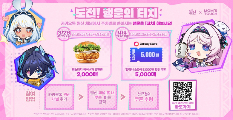 이와 함께 카카오톡 ‘원신’ 채널을 추가하고 채널 홈 내 쿠폰을 클릭하면 3월 28일부터 4월 3일까지는 맘스터치 싸이버거 교환권을, 4월 4일부터 4월 10일까지는 갤럭시 스토어 5천원 할인쿠폰이 선착순으로 제공된다. 싸이버거 교환권은 2,000매, 갤럭시 스토어 할인 쿠폰은 5,000매 한정이다.