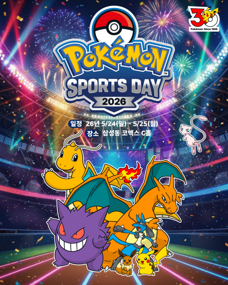 포켓몬 스포츠데이 2026은 5월 24일과 25일 양일간 삼성동 코엑스 C 홀에서 개최되며, ‘포켓몬 월드챔피언십 2026’에 진출할 한국 대표 선수를 선발하는 ‘포켓몬 트레이너스 컵 2026’을 비롯해 ‘포켓몬 카드 게임 2026 코리안리그 파이널’, 30주년 기념 전시, 라이선스 상품 부스, 팝업스토어 등 남녀노소 누구나 즐길 수 있는 다양한 콘텐츠로 구성된다