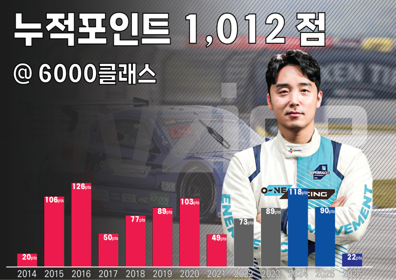‘오네 슈퍼레이스 챔피언십(이하 슈퍼레이스)’에 출전하는 정의철(오네레이싱)이 ‘토요타 가주 레이싱 6000클래스(이하 6000클래스)’에서 개인통산 총 1,012점을 획득하며 6000클래스 역대 2번째로 1,000점을 돌파하는 주인공이 됐다.